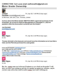 Below is an email string asking about the grader, note Horsley wants me to come over and hang out, what are the odds of that happening? This is the first official acknowledgment the POA purchased the grader.