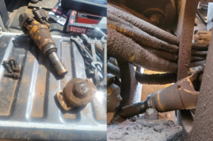 Obviously shaft seals are worn out and the shaft has lateral movement. Another obvious is we didn’t lube it, the grease zerk on the yellow yoke shows no signs of being greased, no fresh grease on the shaft, when you grease you wipe excess off……… just get in it and go.